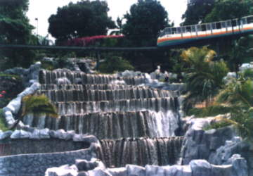 Four large waterfalls, including a waterfall over artificial rock restaurant veranda, and pumping stations built into a very steep hillside for a most unusual cliffside miniature golf course and entertainment center.